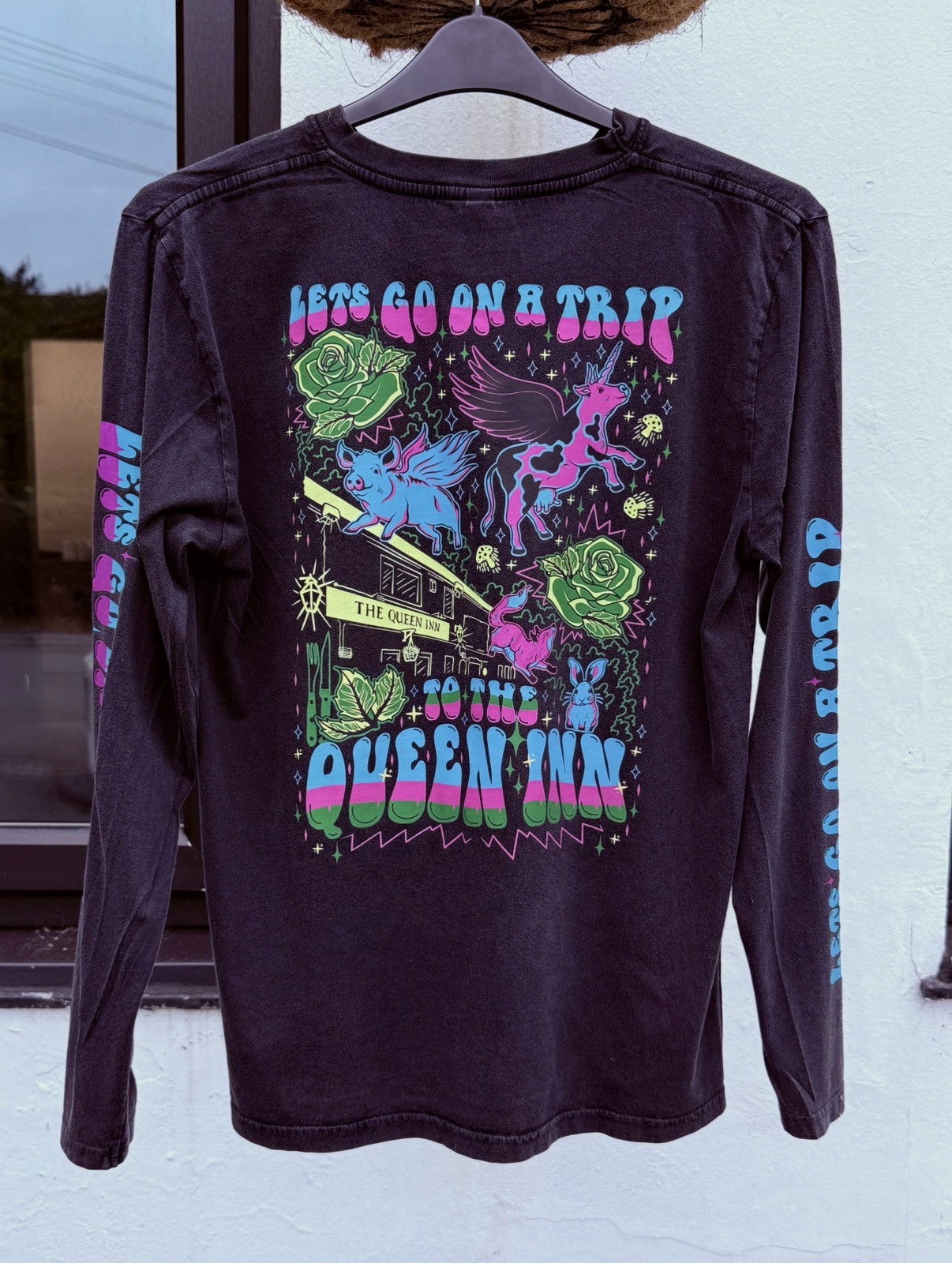 Our fave graphic, designed by @kennysimpson1992, on a stone-washed black long sleeve tee. Carbon neutral, incredibly comfy, and supporting The Queen Inn. What a dream!